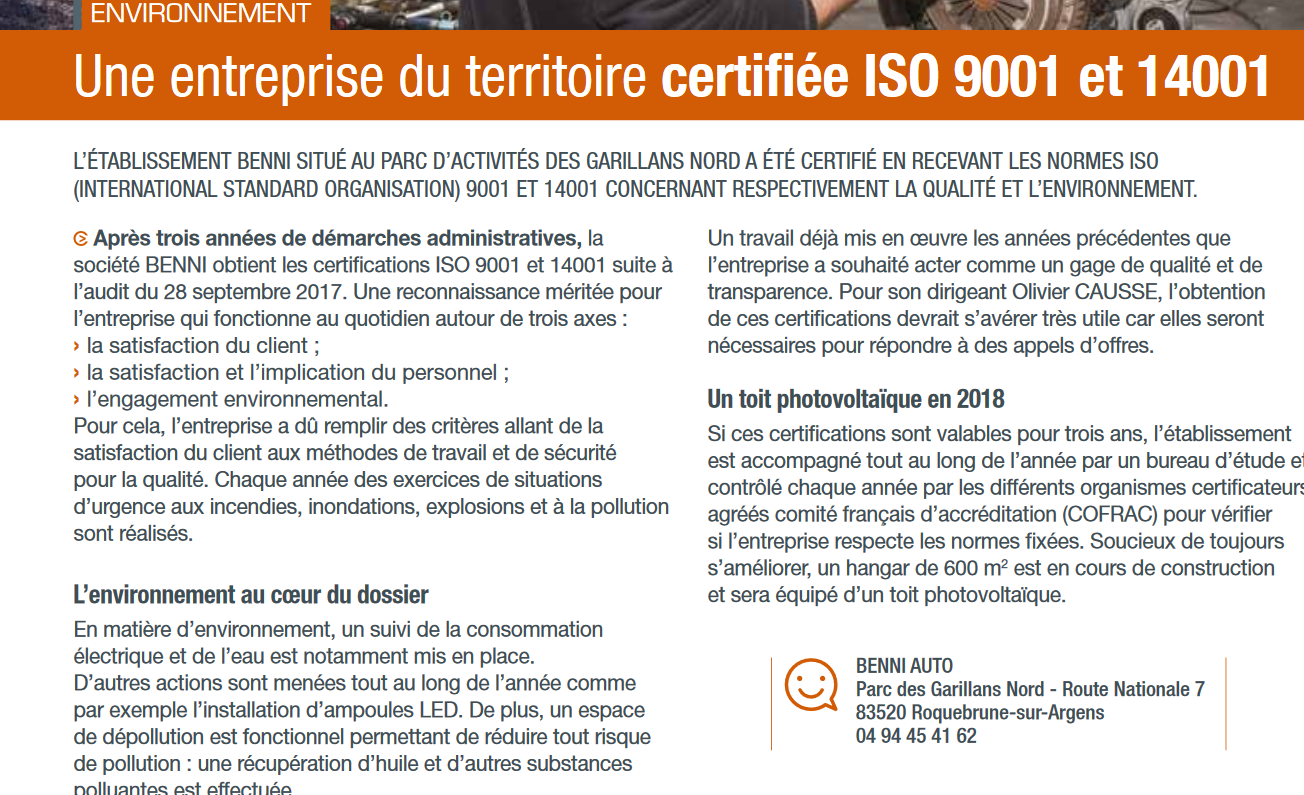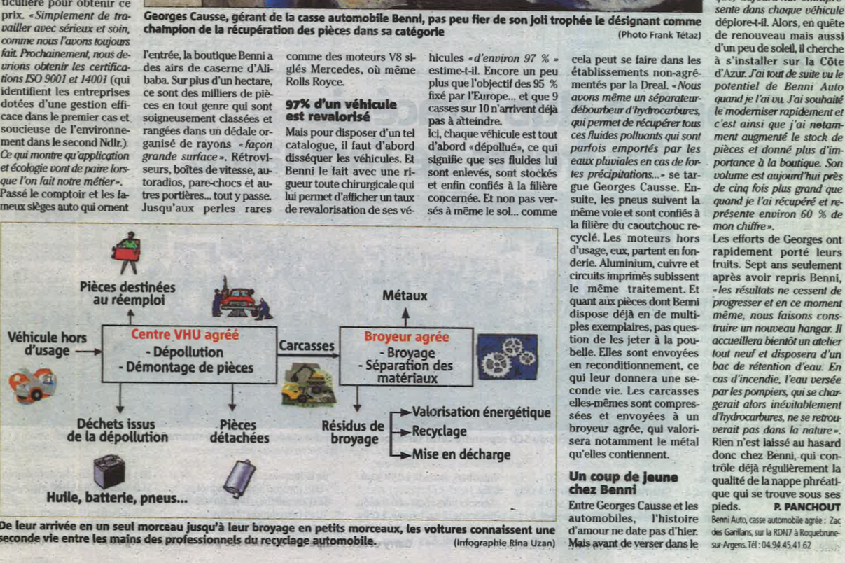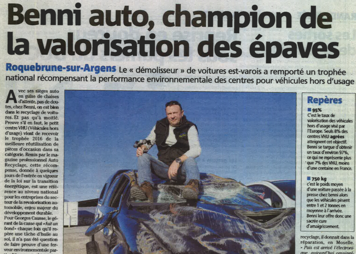 TROPHEE AUTO RECYCLAGE "Une distinction qui vient saluer l'engagement environnemental au quotidien de l'entreprise roquebrunoise [...] organisée par le magazine "Auto-Recyclage" depuis 2011 afin de récompenser l'excellence des professionnels de la filière VHU" Source : La Tribune #53 N° de Février 2017 |